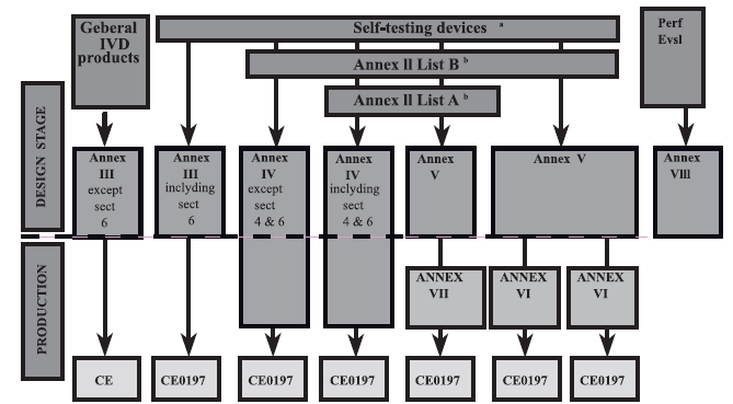 指令根據(jù)IVD器械的預(yù)期用途和風(fēng)險大小,將產(chǎn)品分為 5個類別:List A、List B、自我檢測器材(血糖檢測除外)、其 他類產(chǎn)品和性能評價器材。按照產(chǎn)品的分類,生產(chǎn)商可選擇適合其要求的符合性 評估程序來證明其產(chǎn)品滿足IVDD指令的基本要求見圖。符 合性評估路徑的選擇基于產(chǎn)品的風(fēng)險,產(chǎn)品的風(fēng)險越高,評估路徑的要求越嚴(yán)格。例如,由于ListA的產(chǎn)品存在極高風(fēng)險,根據(jù)附錄4的要求,此類產(chǎn)品的評估路徑中就必須包括設(shè)計文檔的檢查和批驗(yàn)證(第四節(jié)和第六節(jié)),另外,指令中要求這類產(chǎn)品的性能評估還應(yīng)符合通用技術(shù)規(guī)范中對此類產(chǎn)品增設(shè)的要求。