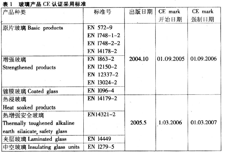 建筑玻璃CE認(rèn)證采用標(biāo)準(zhǔn)有支持性標(biāo)準(zhǔn)和一致性歐洲準(zhǔn)則(hENs)兩類(lèi),支持性標(biāo)準(zhǔn)有包括產(chǎn)品標(biāo)準(zhǔn)、產(chǎn)品特性標(biāo)準(zhǔn)、產(chǎn)品特性計(jì)算或測(cè)量方法標(biāo)準(zhǔn)等,這些支持性的標(biāo)準(zhǔn)由CEN 負(fù)責(zé)起草出版,CEN 標(biāo)準(zhǔn)出版后將取代所有成員國(guó)的國(guó)家標(biāo)準(zhǔn)。一致性歐洲準(zhǔn)則(hENs)是必需強(qiáng)制執(zhí)行的,這些準(zhǔn)則是相應(yīng)產(chǎn)品標(biāo)準(zhǔn)體系的一部分,通常是標(biāo)準(zhǔn)體系的最后一個(gè)部分,名稱(chēng)一般為“第×部分×××產(chǎn)品一致性評(píng)價(jià)”(Part XEvaluation ofconformityProduct standard)。只有夾層玻璃例外,它是一個(gè)單獨(dú)的標(biāo)準(zhǔn)——“EN144492005 建筑玻璃——夾層玻璃和夾層安全玻璃——一致性評(píng)價(jià)方法”。不同玻璃產(chǎn)品CE 認(rèn)證采用的標(biāo)準(zhǔn),進(jìn)入歐洲市場(chǎng)的所有建筑玻璃產(chǎn)品必需遵守這些標(biāo)準(zhǔn)。