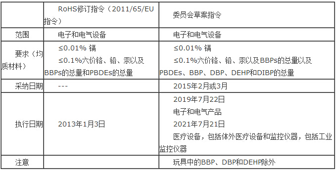 擬議的采納日期為20152月或3,執(zhí)行日期為2019722;醫(yī)療設(shè)備和監(jiān)控儀器的執(zhí)行日期為2021722。RoHS 2和草案指令的重點(diǎn)如下表所示: