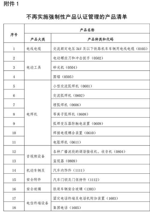 1、對18種產(chǎn)品(見附件1)不再實施強制性產(chǎn)品認證管理的產(chǎn)品清單。